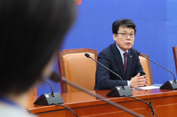 ▲진성준 더불어민주당 정책위의장이 24일 오후 서울 여의도 국회에서 열린 연금개혁 관련 기자간담회에서 발언하고 있다. (뉴시스)