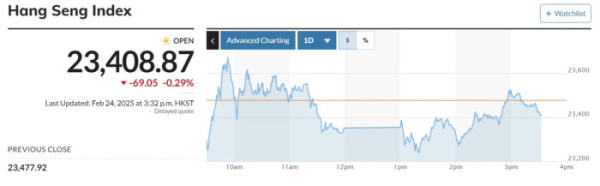 오후 4시 32분 기준 홍콩증시 항셍지수는 전장보다 69.05포인트(0.29%) 내린 2만3408.87에 거래 중이다. 같은 시간 인도 센섹스는 1.01% 상승했지만, 싱가포르 ST종합지수는 0.29% 내리며 보합권에 머물러 있다. 일본증시는 전날 ‘일왕 생일’에 따른 대체공휴일로 휴장했다.