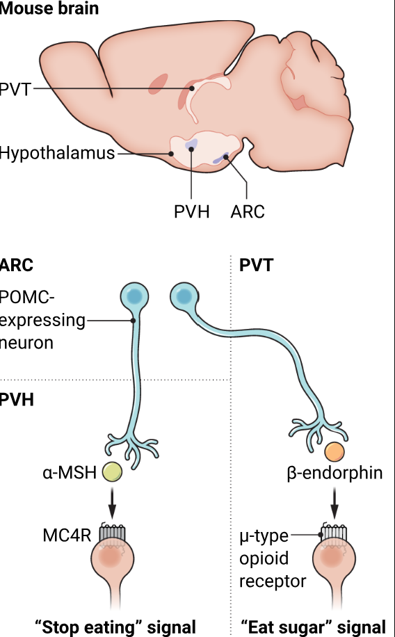POMC 뉴런의 단 음식에 대한 식욕 유발 신호는 시상 실방핵의 보상회로를 활성화한 결과다. 흥미롭게도 이 과정에 뇌하수체에 있는 엔도르핀이 신경전달물질로 관여한다.