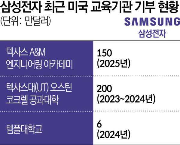 삼성전자는 지난해 11월에는 텍사스주 오스틴에 있는 텍사스대(UT) 오스틴의 코크렐 공과대학에도 100만 달러를 추가로 기부했다. 삼성전자는 이 대학과 2023년 당시 100만 달러를 기부하고, 연구개발에 270만 달러를 투자한다는 계획을 발표하면서 본격적으로 인연을 쌓았다. 삼성전자와 UT 오스틴은 올해 가을 학기부터 반도체 설계 및 제조와 관련된 석사 과정을 개설해 운영할 계획이다. 졸업생들은 향후 삼성전자가 운영하는 현지 공장과 연계돼 채용될 가능성이 크다.