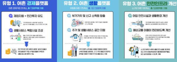 이 사업은 어촌의 규모와 특성에 따라 어촌 경제플랫폼 조성(유형1), 어촌 생활플랫폼 조성(유형2), 어촌 안전인프라 개선(유형3) 등 3개 유형으로 나눠 추진된다.