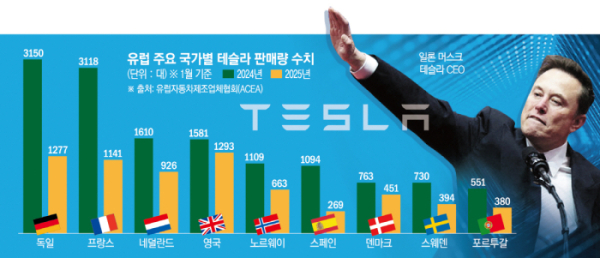 유럽자동차제조업체협회(ACEA)는 1월 한 달간 유럽 내에서 등록된 테슬라 신차 수가 9945대로 전년 동월 대비 45% 줄었다고 밝혔다. 같은 기간 독일과 영국에서 전기차 판매가 늘면서 유럽 전체 전기차 판매량이 37% 급증한 것과는 대비된다.