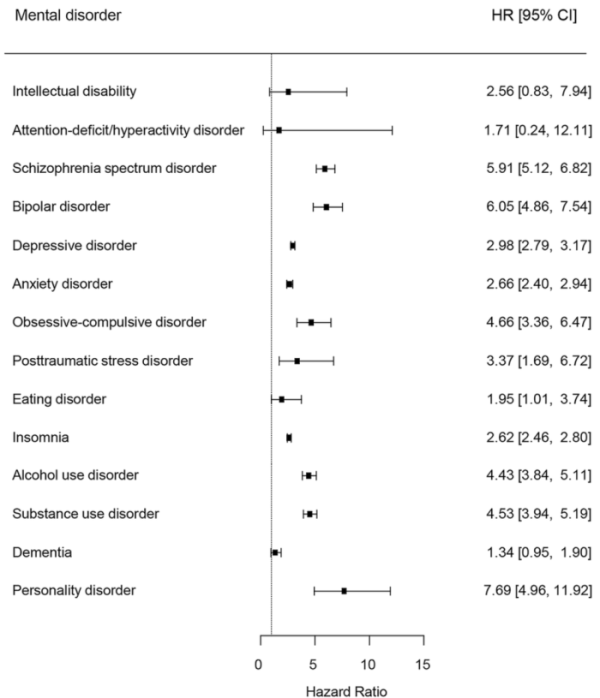 이들의 사망 정보를 기반으로 연구팀이 건강한 사람과 비교해 정신질환으로 자살할 위험을 확인했을 때 성격장애가 있는 경우가 7.7배로 가장 높았다.
