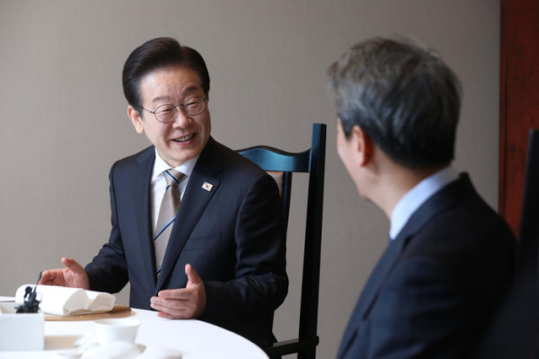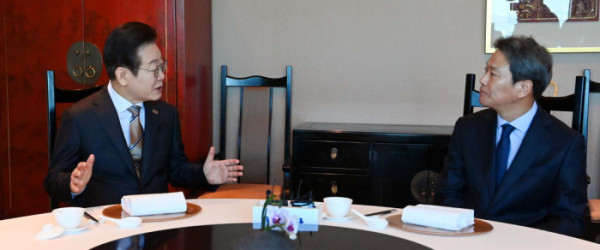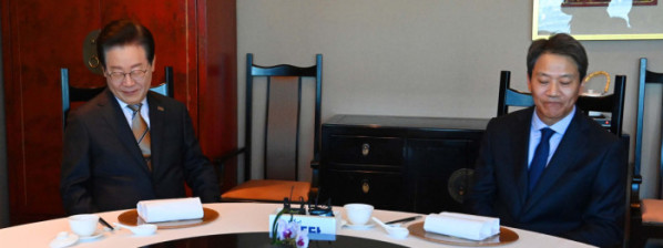 ▲이재명(왼쪽)더불어민주당대표가 27일 서울 영등포구 여의동의 한 음식점에서 임종석 전 대통령비서실장을 만나 이야기하고 있다. 신태현 기자 holjjak@