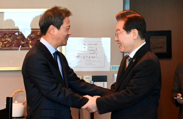 ▲이재명(오른쪽)더불어민주당대표가 27일 서울 영등포구 여의동의 한 음식점에서 임종석 전 대통령비서실장을 만나 악수하고 있다. 신태현 기자 holjjak@
