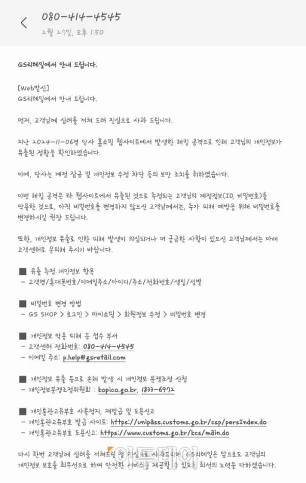 GS리테일이 GS숍 웹사이트에서 158만 건의 개인정보가 유출된 정황을 확인, 이를 사과했다. 26일 GS리테일에 따르면 최근 1년간 로그 기록을 전수조사한 결과 이름, 성별, 생년월일, 연락처, 주소, 아이디, 이메일, 기혼 여부, 결혼기념일, 개인통관고유부호 등 총 10개 항목이 유출됐다. 사진은 GS리테일이 발송한 관련 내용 문자 메시지.
