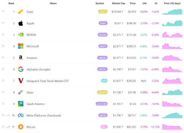 한때 글로벌 자산 시가총액 순위 7위까지 올라갔던 비트코인이 11위까지 추락했다. 상승세를 주도했던 미국이 관세 정책, 인플레이션 우려 등을 이유로 하락세를 주도하면서다. 분석가들 사이에는 현재가 비트코인의 바닥인지를 두고 의견이 갈린다.