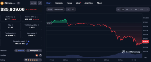 27일 가상자산 시황 플랫폼 코인마켓캡 기준 오후 3시 비트코인 가격은 전날보다 11.46% 하락한 8만5809달러를 나타내고 있다. 이날 새벽 한때는 8만3000달러 선이 붕괴되며 8만2242달러에 거래되기도 했다.