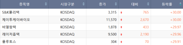 이외 제이투케이바이오(30.00%), 플루토스(29.91%)가 상한가를 기록했다. 하한가를 기록한 종목은 없었다.