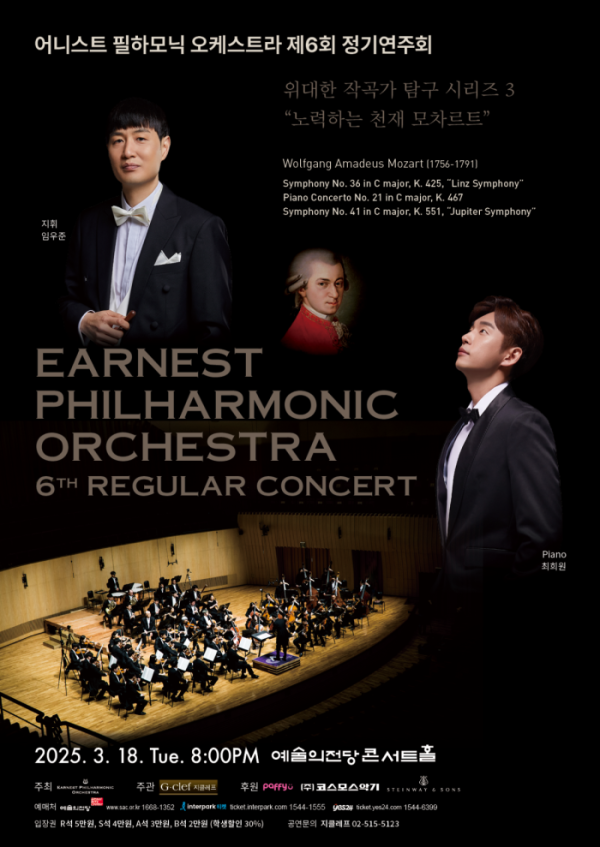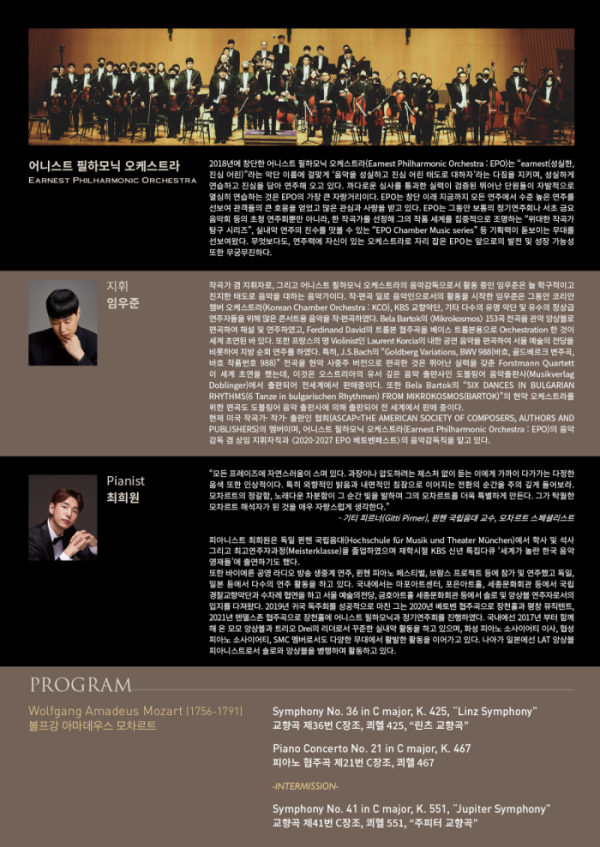 어니스트 필하모닉 오케스트라 음악감독을 맡고 있는 임우준 작곡가 겸 지휘자의 지휘 아래 협연에는 피아니스트 최희원이 함께 한다.