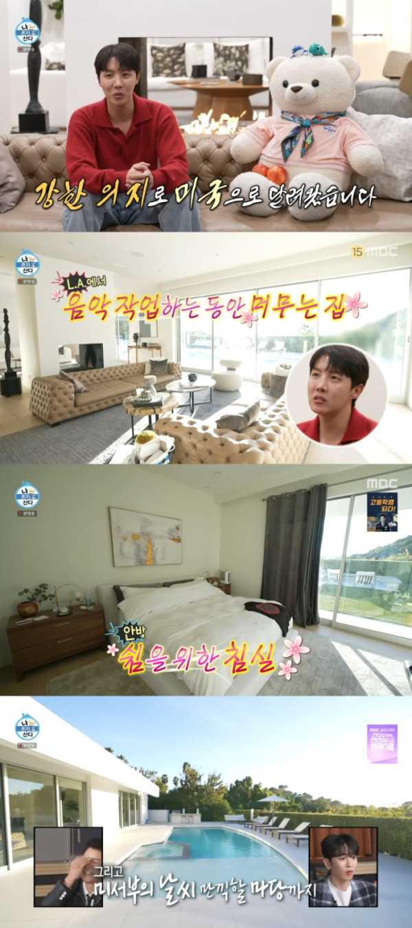 이날 제이홉은 오전 9시 일상을 시작하며 집을 공개했다. 특히 널찍한 거실 밖으로 개인 수영장이 비치며 모두를 놀라게 했다.