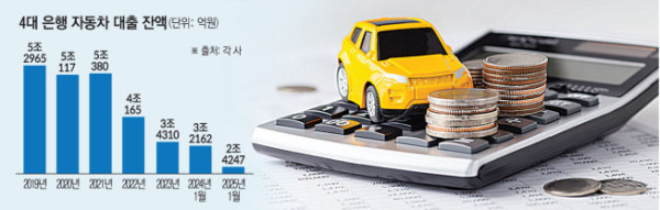 2조4247억 원으로 전년 동기(3조2162억 원) 대비 24.61% 감소했다. 1년 새 8000억 원 가량 급감했다. 시중은행 오토론 잔액은 2019년 5조2965억 원으로 최고치를 찍은 이후 △2021년 5조380억 원 △2022년 4조165억 원 △2023년 3조4310억 원으로 감소세다.