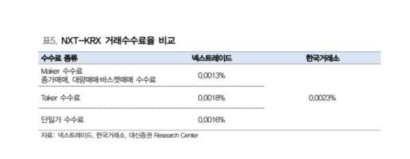 박혜진 대신증권 연구원은 4일 “증권사가 거래소에 지급하는 거래수수료는 현재 거래대금의 0.0023%인데, 넥스트레이드는 지정가주문(메이커)에 대해서는 0.0013%, 시장가 주문(테이커)는 0.0018%를 부과한다”며 “한국거래소 거래량의 15%로 가정하여, 대체거래소 설립으로 증권사 가 연간 수취하는 브로커리지 수수료수익 최대 1조7000억 원 가량 증가할 것으로 예상한다”고 밝혔다.