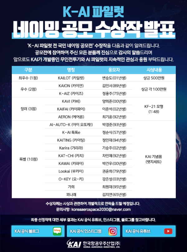 ▲K-AI 파일럿 네이밍 공모 수상작 발표 (제공=한국항공우주(KAI))