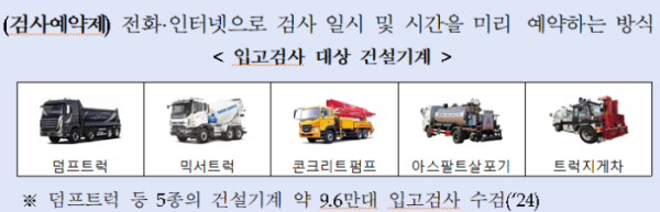 건설기계 입고 검사 예약은 전화·인터넷으로 검사 일시 및 시간을 예약하는 방식이다. 그동안 우천 및 한파 등 건설현장 휴무일에 건설기계의 검사수요가 집중돼 당일 장시간 대기하거나 검사를 받지 못하는 등 건설기계 운전자로부터 불만족 사례가 발생했다. 또 검사를 기다리는 대형 건설기계 때문에 검사소 주변 불법 주·정차 및 교통혼잡으로 민원도 수차례 발생했다.