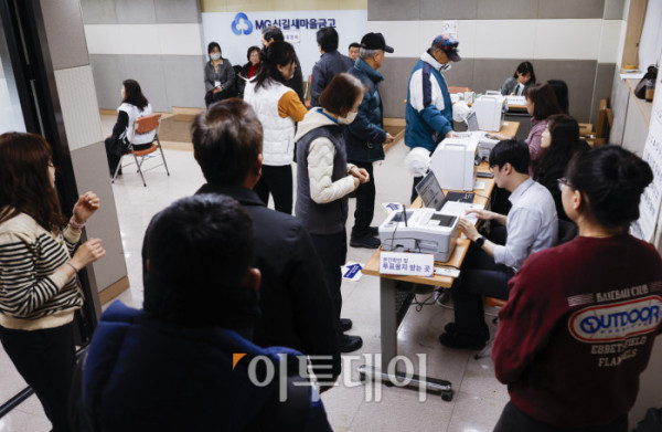 ▲제1회 전국동시새마을금고이사장선거 투표가 시작된 5일 서울 영등포구 신길새마을금고 본점에 마련된 신길제6동 투표소에서 시민들이 투표를 하기 위해 투표지를 받고 있다. 이날 투표는 오전 7시~오후 5시까지 진행된다. 조현호 기자 hyunho@