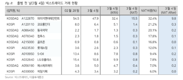 다올투자증권은 대체거래소(ATS) 넥스트레이드 출범 첫날 전체 시장 거래대금에서 22.7%를 차지했다며 향후 에프터마켓과 코스닥시장을 중심으로 거래대금이 늘어날 것이라고 5일 전망했다.