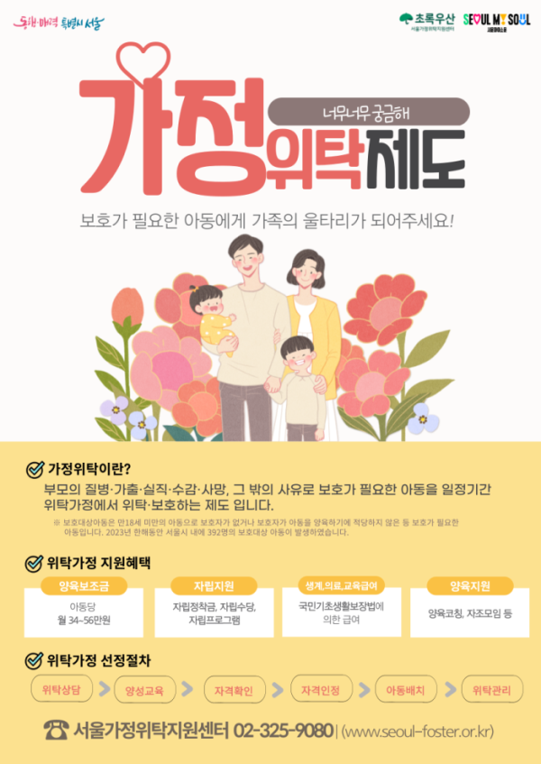서울시가 부모의 사망, 질병, 학대 등으로 보호가 필요한 아동이 건강한 사회 구성원으로 성장할 수 있도록 일반 가정에서 일정 기간 보호‧양육하는 제도인 ’가정위탁아동 보호제도‘의 지원을 강화한다고 5일 밝혔다.