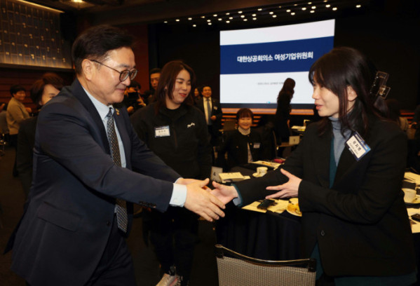 ▲우원식 국회의장이 5일 서울 중구 대한상공회의소에서 열린 대한상의 여성기업위원회 창립총회에서 여성기업인들과 인사하고 있다. 신태현 기자 holjjak@