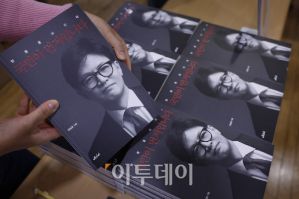 ▲5일 서울 마포구 청년공간JU에서 열린 한동훈의 선택, 국민이 먼저입니다 발간 기념 북콘서트에 한동훈 국민의힘 전 대표의 책이 진열되어 있다. 조현호 기자 hyunho@