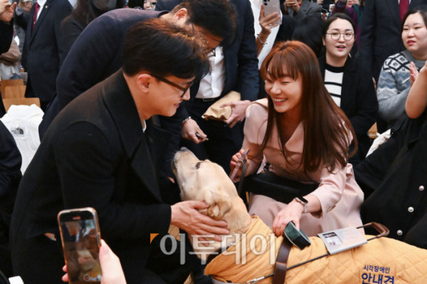 ▲한동훈(왼쪽) 국민의힘 전 대표가 5일 서울 마포구 청년공간JU에서 열린 한동훈의 선택, 국민이 먼저입니다 발간 기념 북콘서트에 참석하며 김예지 의원의 안내견 태백이와 인사를 하고 있다. 조현호 기자 hyunho@