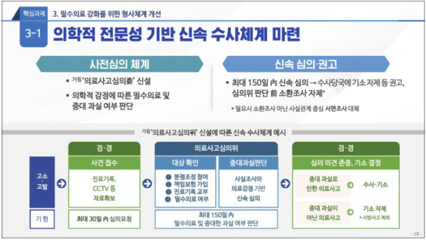 정부가 의료사고 발생 시 별도 기구에서 중대과실 여부를 판단한 뒤 사법절차를 진행하는 수사체계를 마련한다. 또 환자와 의료진 간 합의를 존중해 반의사불벌을 폭넓게 인정한다.