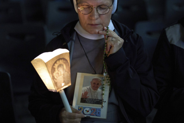 ▲프란치스코 교황의 사진을 든 가톨릭 수녀가 8일(현지시간) 바티칸 성 베드로 광장에서 교황의 쾌유를 위해 기도하고 있다. 바티칸/AP연합뉴스