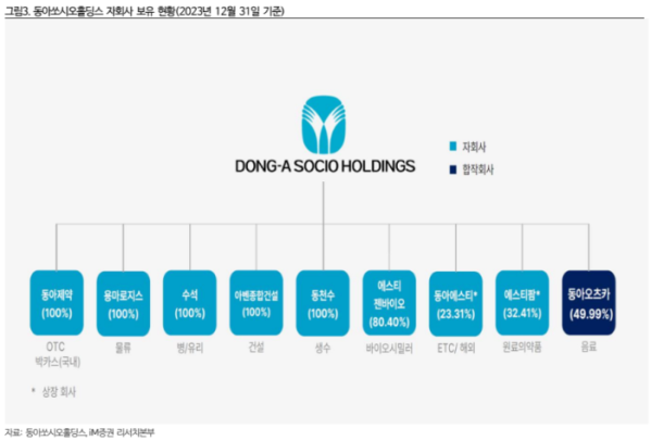 iM증권은 동아쏘시오홀딩스에 대해 올해 자회사 실적 턴어라운드 등을 기반으로 실적 개선이 가시화할 것으로 전망했다. 투자의견은 ‘매수’, 목표주가는 14만 원으로 하향 조정했다. 전 거래일 기준 종가는 9만8100원이다.