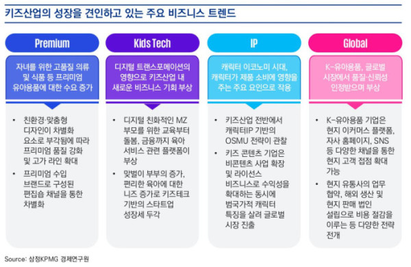 10일 삼정KPMG는 ‘저출생 시대 속 골드키즈가 이끄는 키즈산업’ 보고서를 발간하며 키즈산업의 주요 비즈니스 트렌드로 △프리미엄화 △키즈테크(Kids Tech) △캐릭터 지식재산권(IP) △글로벌 시장 진출을 꼽았다.