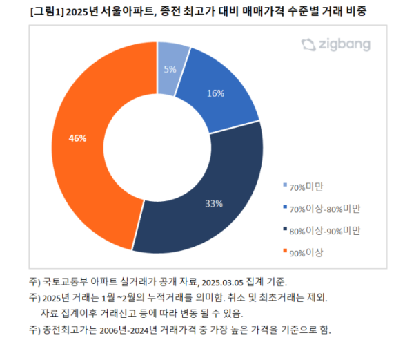 10일 직방이 국토교통부 아파트 실거래가 공개시스템 아파트 매매가격을 분석한 결과 올해 1~2월 서울 아파트 매매 5983건 중 2759건(46%)은 종전 최고가(2006~2024년)와 비교해 90% 이상의 가격 수준에서 거래된 것으로 조사됐다. 또 80% 이상~90% 미만 가격선에서 거래된 비중도 33%를 차지했다.