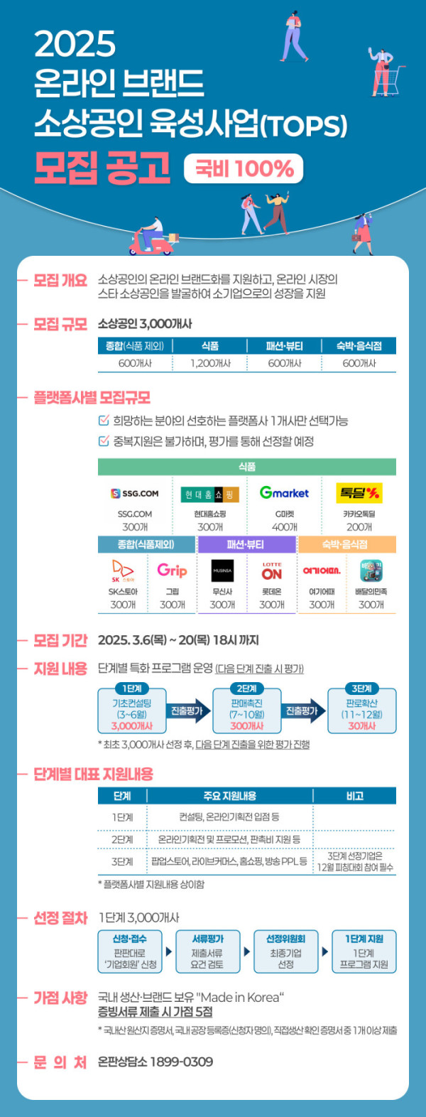 중소벤처기업부 산하 한국중소벤처기업유통원이 올해 온라인 브랜드 소상공인 육성사업 ‘TOPS 프로그램’을 전담 운영한다고 10일 밝혔다. 올해 처음 추진되는 ‘TOPS 프로그램’은 발전 가능성이 큰 소상공인을 민간(수행기관)이 직접 발굴해 육성하는 사업이다. 소상공인 3000개사를 선정, 지원할 예정이며 총 10개 온라인 민간 플랫폼이 함께 참여한다.