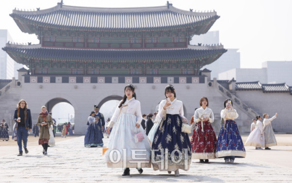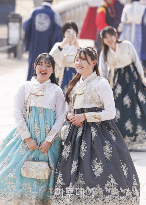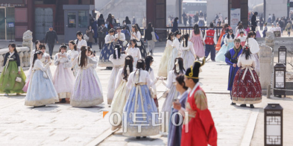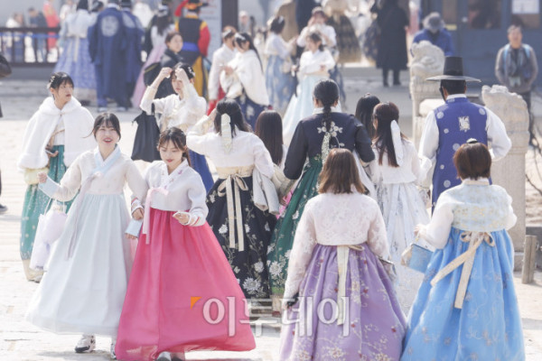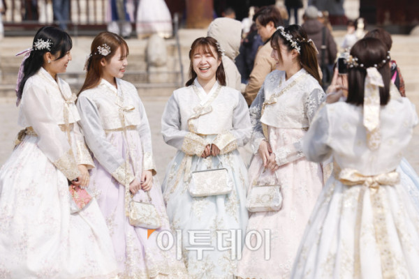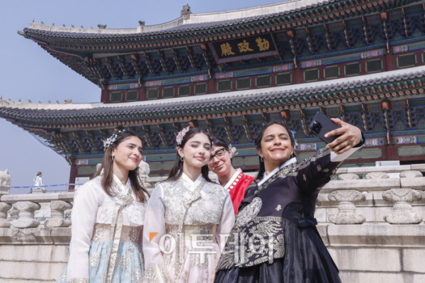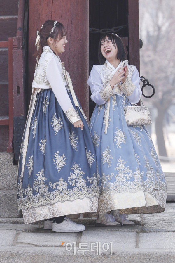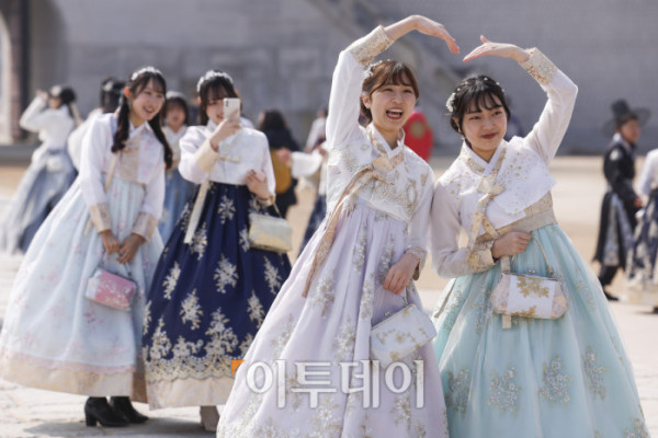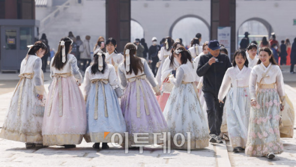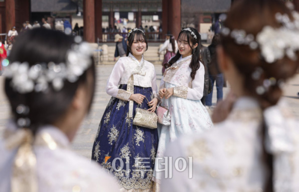 서울의 한낮 기온이 15도 안팎까지 오르며 봄 날씨를 보인 10일 서울 종로구 경복궁에서 한복을 입은 외국인 관광객들이 즐거운 시간을 보내고 있다. 조현호 기자 hyunho@