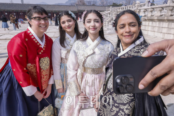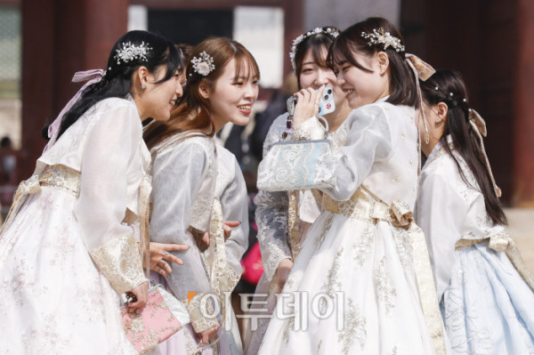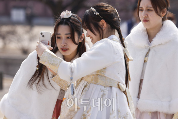 ▲서울의 한낮 기온이 15도 안팎까지 오르며 봄 날씨를 보인 10일 서울 종로구 경복궁에서 한복을 입은 외국인 관광객들이 셀카를 찍고 있다. 조현호 기자 hyunho@