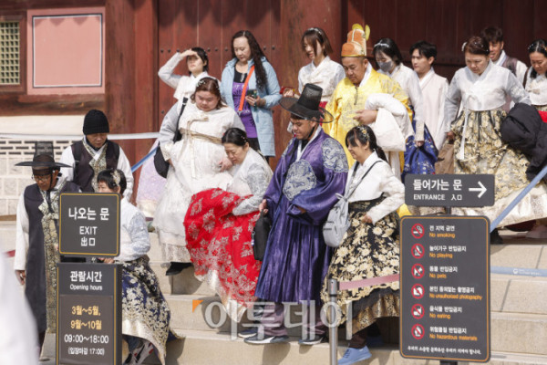 ▲서울의 한낮 기온이 15도 안팎까지 오르며 봄 날씨를 보인 10일 서울 종로구 경복궁에서 한복을 입은 외국인 관광객들이 발걸음을 옮기고 있다. 조현호 기자 hyunho@