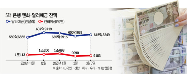 10일 금융권에 따르면 5대 은행(KB국민·신한·하나·우리·NH농협)의 7일 기준 엔화예금 잔액은 9183억 엔으로 지난 1월(1조693억 엔) 대비 1510억 엔 감소했다. 월말 기준 엔화예금이 1조 엔 밑으로 내려간 것은 2023년 8월(9950억 엔) 이후 처음이다.