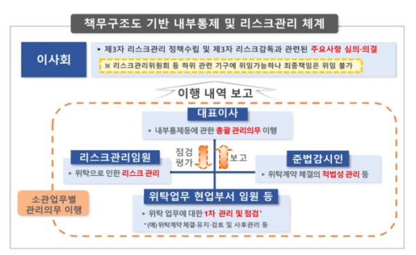이사회는 금융기관의 제3자 의존도 및 종속성을 고려해 리스크관리 정책을 수립하고 주요 사항을 심의·의결해야 한다. 경영진은 이사회의 정책을 바탕으로 관리체계를 구축·운영하며 효과적인 관리 조치를 이행한 후 이를 이사회에 보고해야 한다. 책무구조도를 적용하는 금융사는 책무구조도에 제3자 리스크관리 체계를 반영해야 한다.