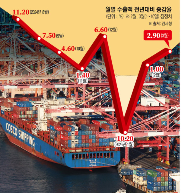 한국 수출은 2023년 10월 전년 동월 대비 증가율이 플러스로 전환된 뒤 지난해 12월까지 15개월 연속 플러스 기록을 이어왔으나 1월에 그 흐름이 멈췄다가 지난달 조업일수 덕에 간신히 증가세로 돌아선 바 있다.