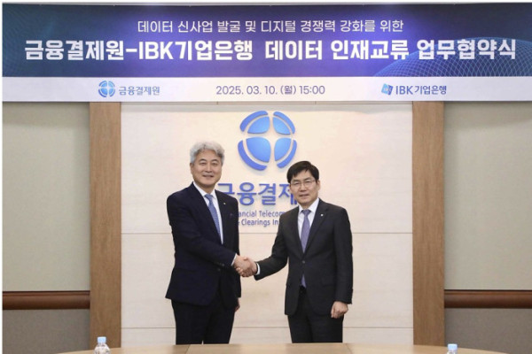 금융결제원은 10일 기업은행과 데이터 신사업 발굴과 디지털 경쟁력 강화를 위한 인재교류 업무협약을 체결했다고 밝혔다고 11일 밝혔다. 금결원은 이번 협업사례의 성과물을 전체 금융회사와 공유해 금융권 공동의 신규 데이터 서비스 발굴을 위한 초석을 마련하고 금융권 데이터 협력 모델을 확장할 방침이다.