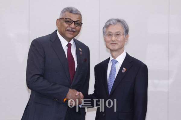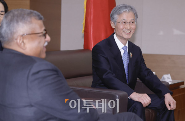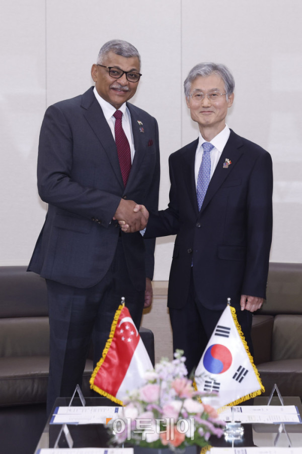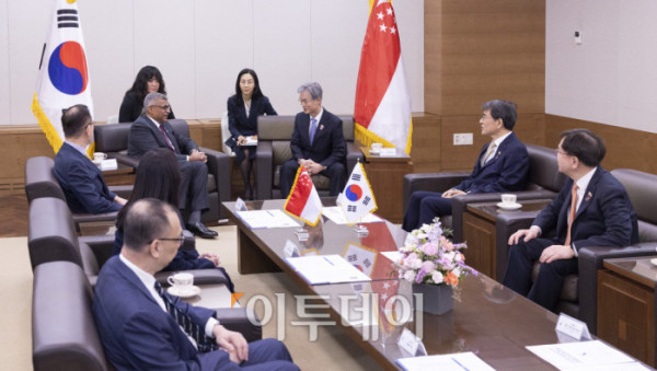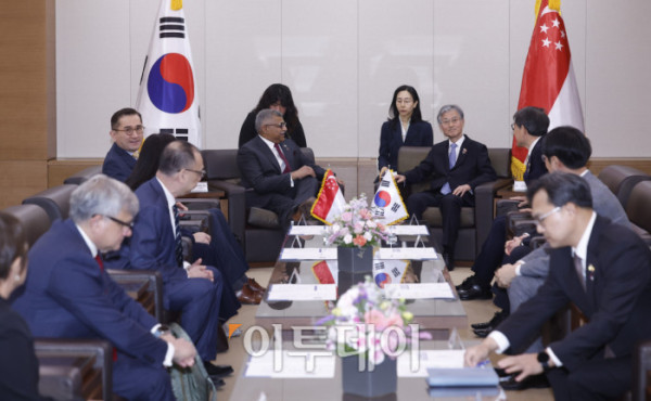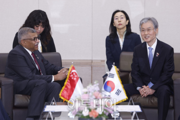 ▲조희대(오른쪽) 대법원장이 11일 서울 서초구 대법원에서 순다레쉬 메논 싱가포르 대법원장을 접견하고 있다. 조현호 기자 hyunho@