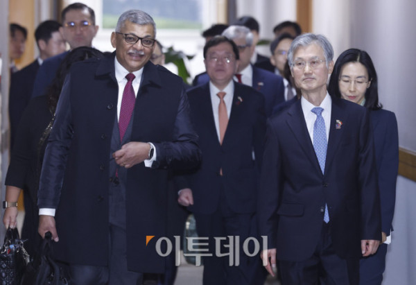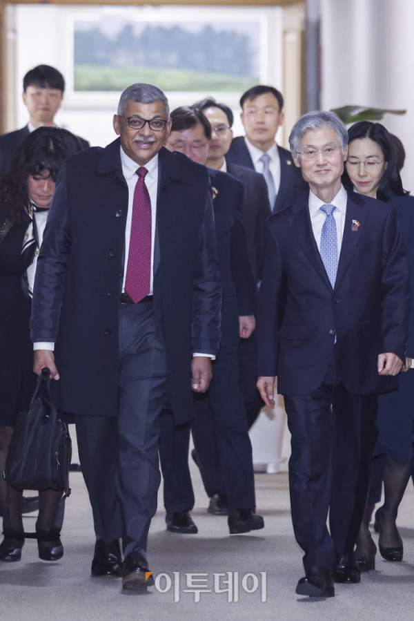 ▲조희대(오른쪽) 대법원장이 11일 서울 서초구 대법원에서 순다레쉬 메논 싱가포르 대법원장을 접견하며 접견실에 들어서고 있다. 조현호 기자 hyunho@