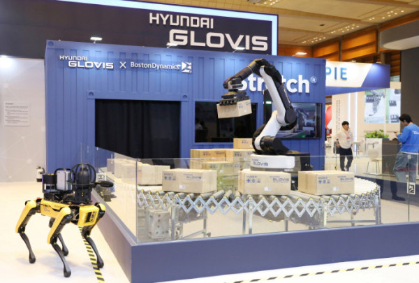 ▲[사진2]서울 강남구 코엑스에서 12일 열린 ‘2025 스마트공장∙자동화산업전_의 현대글로비스 부스에서 보스턴다이내믹스 물류로봇 스트레치의 시연이 진행되고 있다. (사진=현대글로비스)
