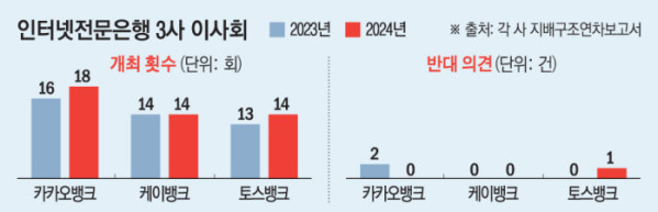 12일 인터넷은행 3사(카카오·케이·토스뱅크)의 지배구조 및 보수체계 연차보고서에 따르면 지난해 열린 이사회에서 사외이사가 반대표를 행사한 사례는 단 한 건에 불과했다. 보고 안건에 대한 의견 제시는 전무했다.