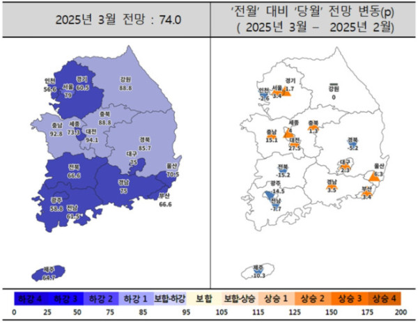 주산연은 "대전은 철도 지하화 선도사업 선정으로 지역 사업경기 활성화에 대한 기대감이 반영된 것으로 보인다"며 "전북과 광주는 주택 매매 감소, 아파트 가격 하락세, 착공 물량 감소 등이 부정적으로 작용했다"고 설명했다.