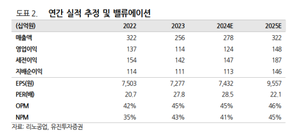 유진투자증권은 올해 리노공업의 연간 실적 전망치를 상향 조정했으나, 투자의견과 목표주가를 각각 ‘매수’, 26만 원으로 유지한다고 밝혔다. 현재주가(12일 기준)는 21만1500원이다.