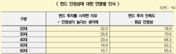 펀드에 대한 인식은 연령대별로 다르게 나타났다. 펀드 투자 이유를 묻는 문항에서 ‘안정성이 높다는 생각에’라고 답한 비율은 20대와 30대가 각각 32%, 26.8%로 높았고, 40대는 20.4%, 50대는 18.9%, 60대는 10.7%로 저연령일수록 안정성이 높은 투자처로 인지하고 있었다.