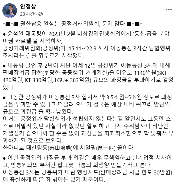 안정상 전 더불어민주당 정보통신·방송미디어 수석전문위원(중앙대 겸임교수)은 13일 페이스북을 통해 "이번 공정위의 과징금 부과 의결은 방송통신위원회와의 부처 간 밥그릇 다툼 중 희생양을 만든 것"이라며 "이동통신 3사는 방통위가 내린 '판매장려금 지급 한도 30만 원'이라는 행정지도에 충실하게 따른 죄밖에 없다"고 했다.