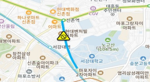 18일 오전 8시 18분 서울 마포구 백범로 신촌오거리(신촌역 부근)에서 서강대앞(서강대입구) 오르막길 진행방향이 강설로 인해 전면 통제되고 있다.
