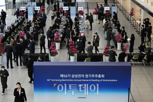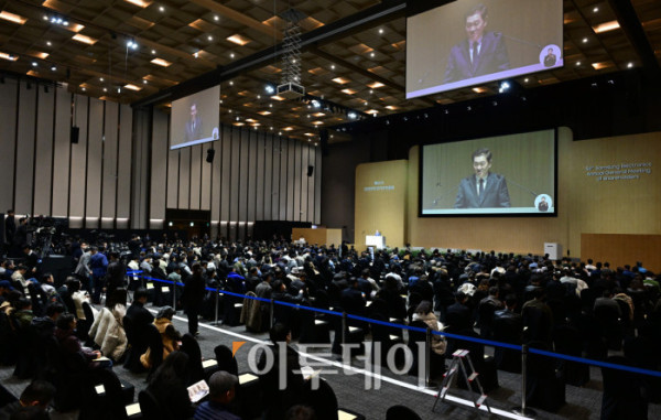▲19일 경기 수원시 영통구 수원컨벤션센터에서 열린 삼성전자 제56기 정기 주주총회에 주주들이 주총장에 참석하고 있다. 조현호 기자 hyunho@