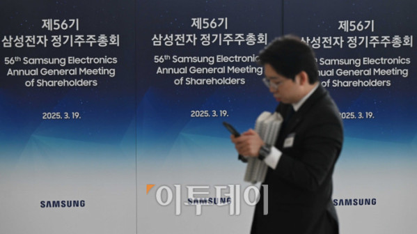 ▲한종희 삼성전자 부회장이 19일 경기 수원시 영통구 수원컨벤션센터에서 열린 제56기 삼성전자 정기주주총회에 참석해 있다. 조현호 기자 hyunho@