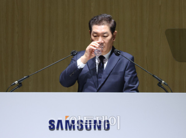 ▲한종희 삼성전자 부회장이 19일 경기 수원시 영통구 수원컨벤션센터에서 열린 제56기 삼성전자 정기주주총회에서 물을 마시고 있다. 조현호 기자 hyunho@